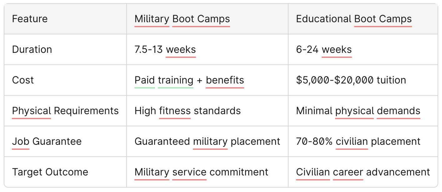 Military programs offer guaranteed placement and paid training but require multi-year service commitments, while educational boot camps provide flexibility for civilian careers but involve significant financial investment with variable job placement outcomes.